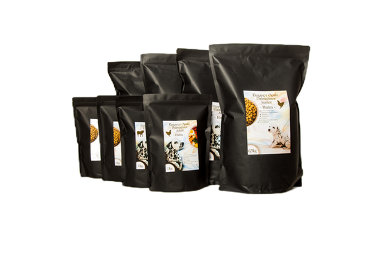 Ofengebackenes Alleinfuttermittel für heranwachsende Hunde in Lebensmittelqualität. Schmackhaftes, besonders leicht verdauliches Alleinfutter für junge Hunde ab der 3. Lebenswoche. Je nach gewählter Sorte, bestes Fleisch mit Kartoffeln und Zucchini. Bietet eine optimale Deckung des Stoffwechsel-Bedarfs im Wachstum. Hohe biologische Wertigkeit an Energieträgern und essenziellen Aminosäuren im perfekten Verhältnis zusammengesetzte hochwertige Proteine, Fette, Mineralstoffe. Nur 1 Fleischquelle. Ein ausgewogenes Calcium-Phosphor-Verhältnis und der Verzicht auf Getreide sind uns hierbei ebenso wichtig, wie der Verzicht auf alle Arten von Zucker oder Zuckerersatzstoffe. Wir backen ohne die Zugabe von allergieauslösenden Enzymen, sowie frei von künstlichen Konservierungsstoffen oder Geschmacksverstärkern. Das Futter bietet Ihrem Junghund eine artgerechte und naturbelassene Fütterung von Anfang an und stellt die Weichen für ein glückliches und gesundes Leben. Die gebackene Krokette regt beim Fressen den Speichelfluss an und unterstützt somit die Verdauung. Die hart gebackenen Kroketten stärken die Kaumuskulatur von Anfang an. Die Aufzucht von Welpen ist immer etwas Besonderes. Der Welpe hat in der Wachstumsphase einen erhöhten Energiebedarf. Das Elegancy Opals Juniorfutter ist optimal auf diesen Bedarf abgestimmt. Die Kartoffel als hochwertige Kohlenhydratquelle und wichtiger Vitamin D3 Lieferant, sowie die Bierhefe, die auch durch Ihren natürlichen Vitaminkomplex die Versorgung des Hundes mit wichtigen Nährstoffen unterstützt, runden das Futter zur ganzheitlichen Ernährung ab. Das Trockenfutter sollte mit hochwertigen Ölen ergänzt werden.